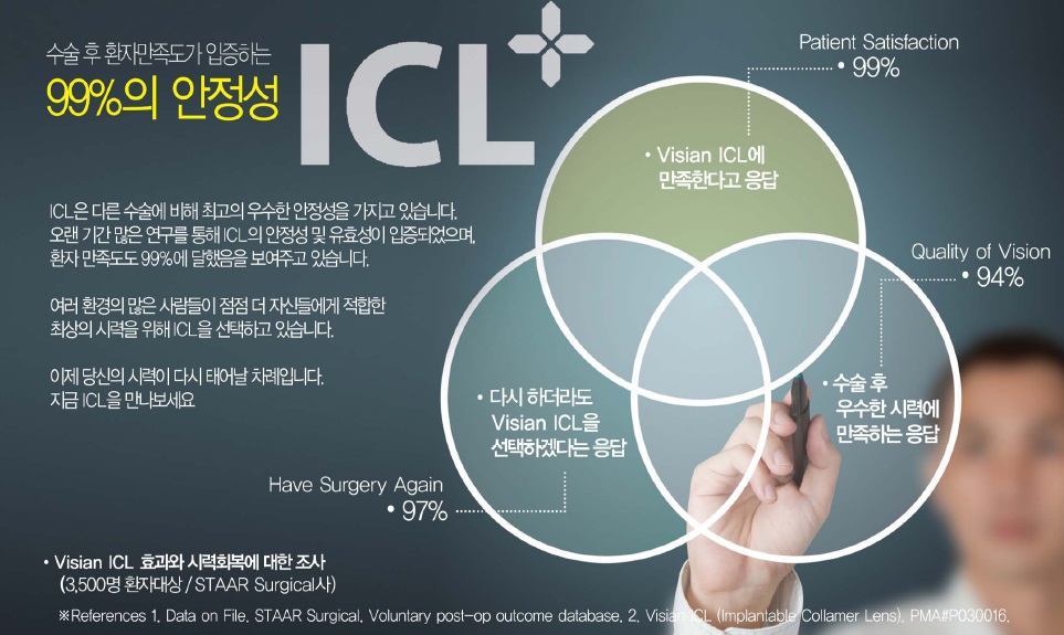 레이저로 각막을 깍지 않기 때문에 각막을 건드리지 않고 더욱 안전한 시력교정을 원하시는분들의 시력의 질까지 만족 할 수 있는 수술방법입니다.
