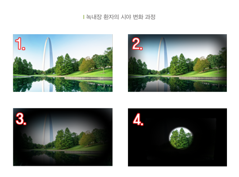 > 녹내장 진행에 따라 시야가 좁아집니다.