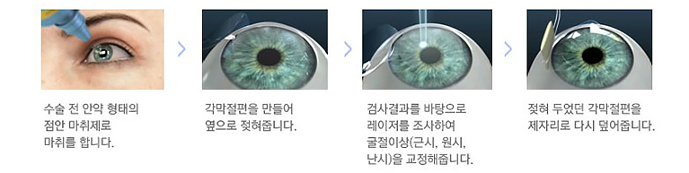 각막절삭기를 이용하여 각막 상피와 각막실질의 일부를 포함하는 각막 절편을 만든 후 레이져로 절삭하고 절편을 다시 덮어주는 수술입니다.