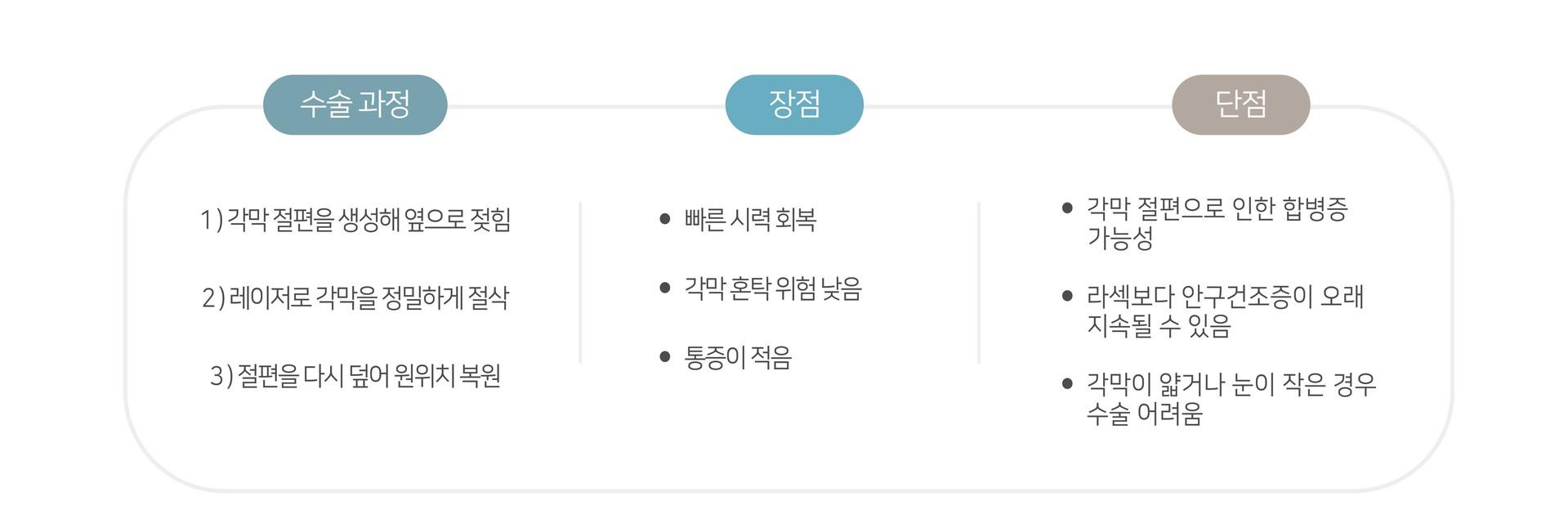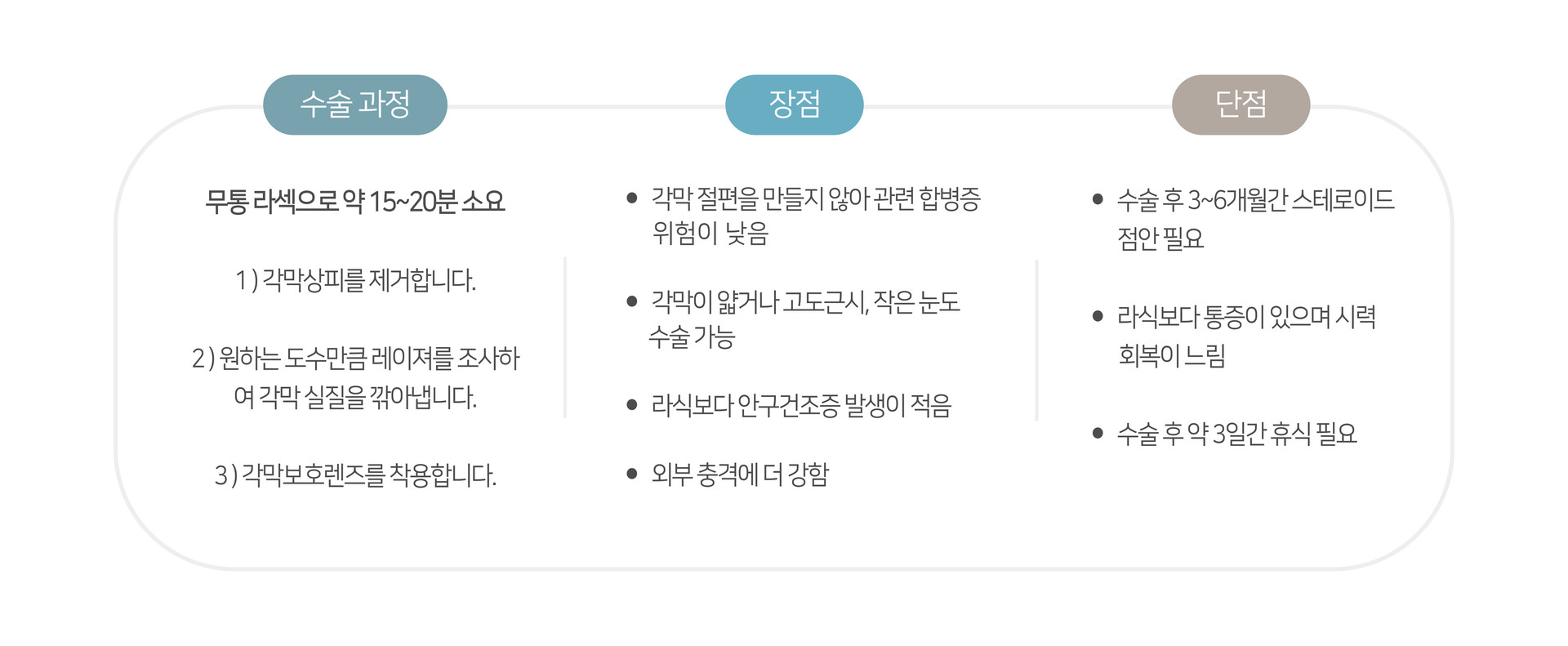 수술 후 통증이 적고 시력회복이 빠른것이 장점이지만 잔여각막이 충분하지않고 안정성이 떨어진다는 단점이 있습니다.